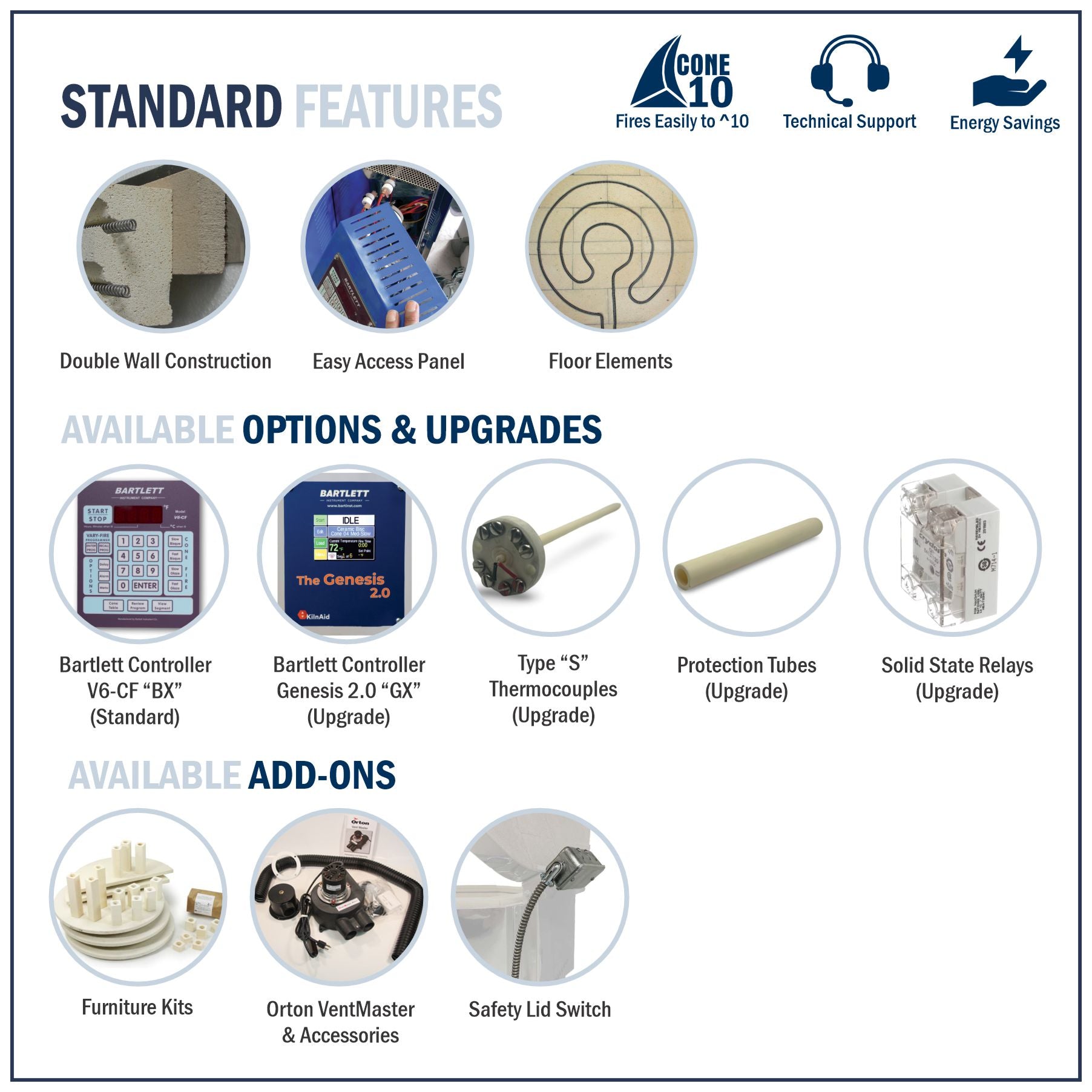 This Cone Art BX1818D kiln is an excellent choice for the home studio or school. It is a double insulated kiln with 2 ½" of premium firebrick plus 1" of block insulation. This double wall insulation ensures a safer, cooler jacket and approximately 30% energy savings over single wall kilns.