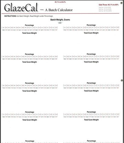 Batch sizes range from 500 grams to 10,000 grams, at intervals of 500 gram batch sizes! GlazeCal measures percentages to the tenth decimal place, up to 80.0%.